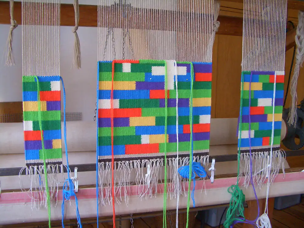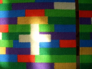Andachtsbild „Gottes bunter Garten“ Die dreiteilige Webarbeit entstand als Projekt eines Workshops während einer Kinderfreizeit im Sommer 2025. Anhand dieser fröhlich-farbigen Arbeit konnten Teilnehmerinnen und Teilnehmer ihre Fertigkeiten am Hochwebstuhl ausprobieren. Zudem erkundeten sie die Symbolik, entdeckten die liturgischen Farben und lernten deren Bedeutung und Gebrauch im Kirchenraum kennen.